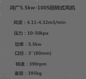此款型號(HC-100S回轉風機)所配套為4級純銅國標品牌電機5.5kw,電機不耐濕,請保持電機干燥,注意電機轉向應與風機轉向標志一致。本產品電機配置均為380V電源。有需要220V電源事先說明。默認按照380V電源配置電機。